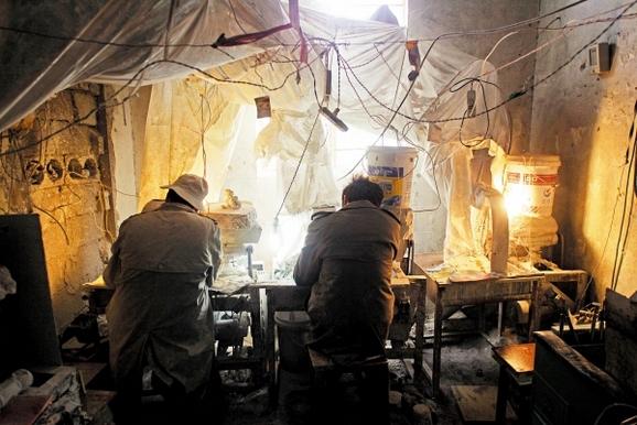 彭元连从上世纪70年代就开始进入邳州玉雕厂,算是本地最早从事玉雕业的“元老”之一。他告诉本刊记者:“做玉雕是一个很苦的活。”粉尘对身体有害,南方的冬天冰寒彻骨,打磨的工人要整天赤手接触凉水。即便有机械的动力,要把一块顽石切割出模样,也需要耗费大量的体力。本刊记者看到这位工人手里的貔貅,即便只有一本书大小,完成切割也要两天的时间。脸上、身上都沾着白色粉末的工人们,穿着长长的围裙,戴着塑胶的长臂袖套,在昏天黑地的车间里,就着昏黄的灯光,戴着耳机听着“山寨”手机音乐,度过这个枯燥、冰冷的过程。“这是一个农民产业,邳州从事这个行业的都是农民。只有大量的农民工才能把这个行业延续下去。”彭元连对本刊记者说。