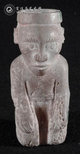 石人(图2) 通高9.5厘米。安阳殷墟妇好墓出土。白色石质,圆雕,略有风化。跽坐,双手抚膝,头微低。瘦长脸,尖颌,前额突出,高颧骨,粗眉大眼,右眼的上眼睑压下眼睑,蒜头鼻,大嘴微张,双耳较大。发向后梳,贴垂后脑,在右耳后侧拧成辫子,往上盘至头顶,绕至左耳后侧,再至右耳后,辫梢塞在辫根下。头上戴一较宽的圆箍形“頍(kuǐ)”用以束发,腹部悬长条形“蔽膝”。这件石人,无衣赤脚,仅在腰部悬一长条布蔽体,面似男性,可能是一男性奴隶。妇好墓出土的玉石人像有十余件,其最重要意义在于为今人研究殷商时代人们的衣冠、发式,以及不同等级的人物形象,增添了珍贵的实物资料。